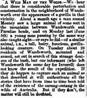 Originally posted in the Inverell Argus on 9th Jun 1899 and heavily syndicated across many newspapers of the time. The article describes an encounter with a “Wild Man” near Wandsworth NSW.